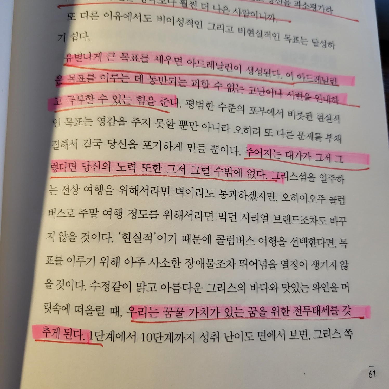 유별나게 큰 목표를 세우면 아드레날린이 생성된다. 이 아드레날린은 목표를 이루는 데 동반되는 피할 수 없는 고난이나 시련을 인내하고 극복할 수 있는 힘을 준다.