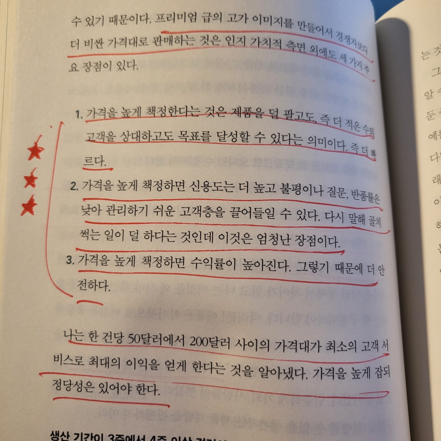 1. 가격을 높게 책정한다는 것은 제품을 덜 팔고도 즉 더 적은 수의 고객을 상대하고도 목표를 달성할 수 있다는 의미이다.