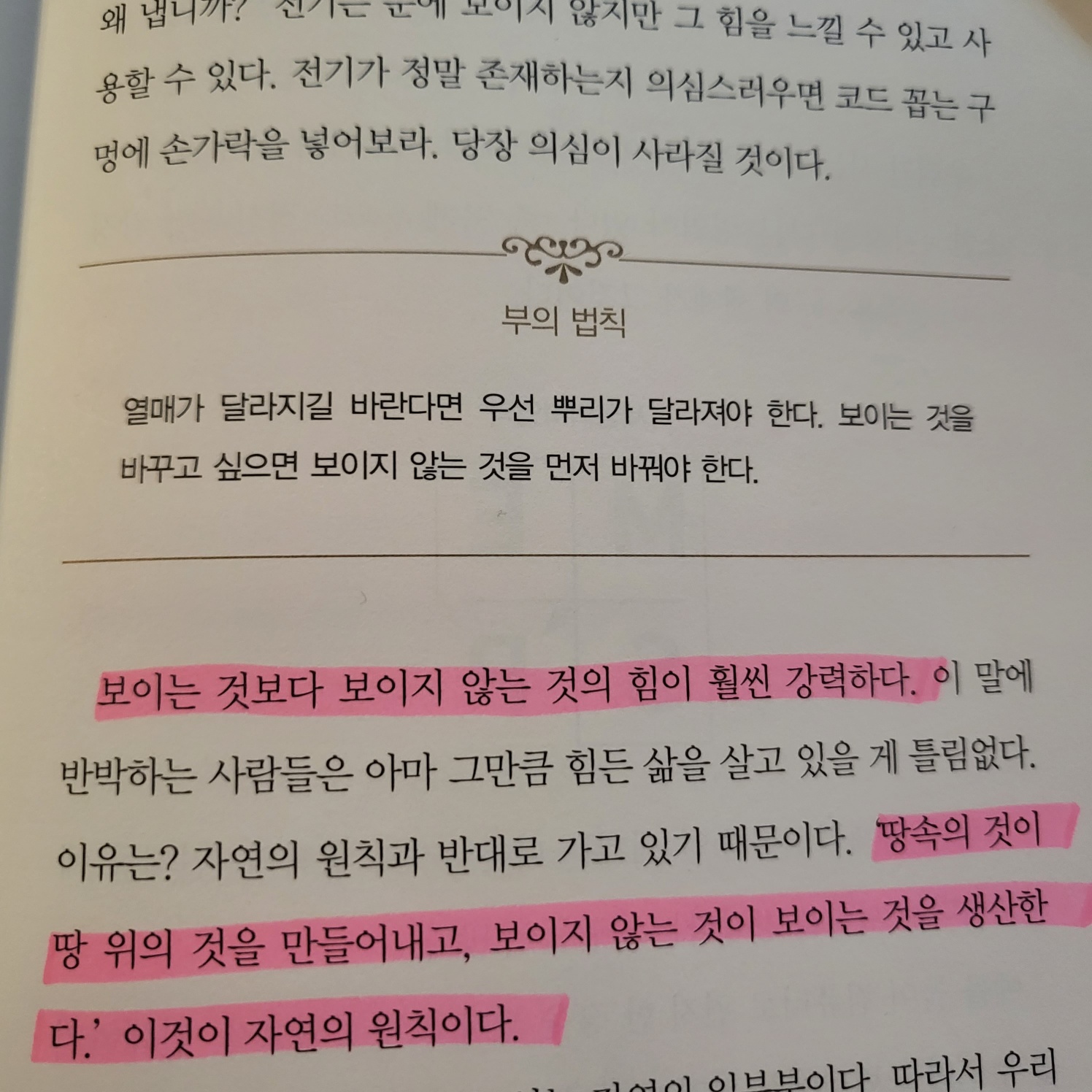 "땅속의 것이 땅 위의 것을 만들어내고, 보이지 않는것이 보이는 것을 생산한다.