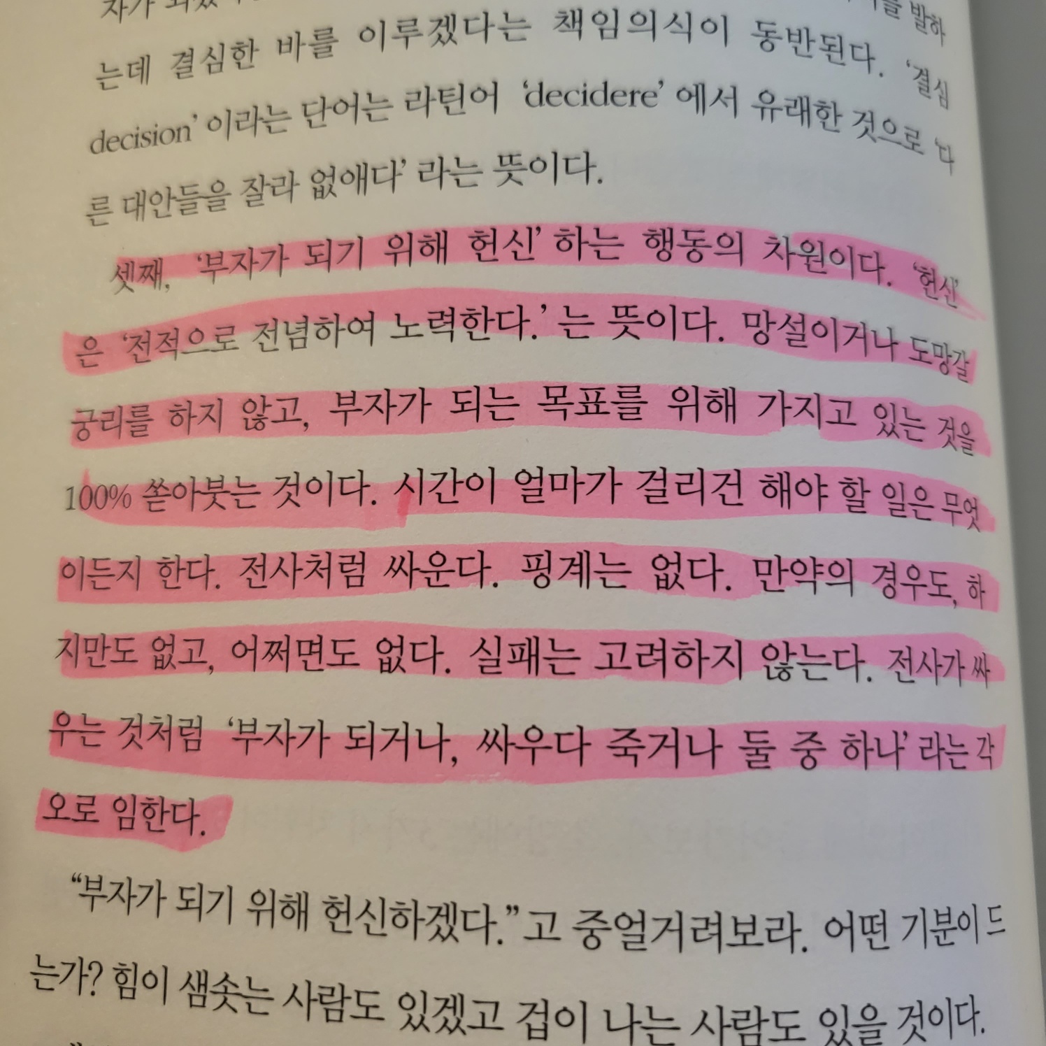 헌신은 전적으로 전념하여 노력한다는 뜻이다. 망설이거나 도망갈 궁리를 하지 않고 부자가 되는 목표를 위해 가지고