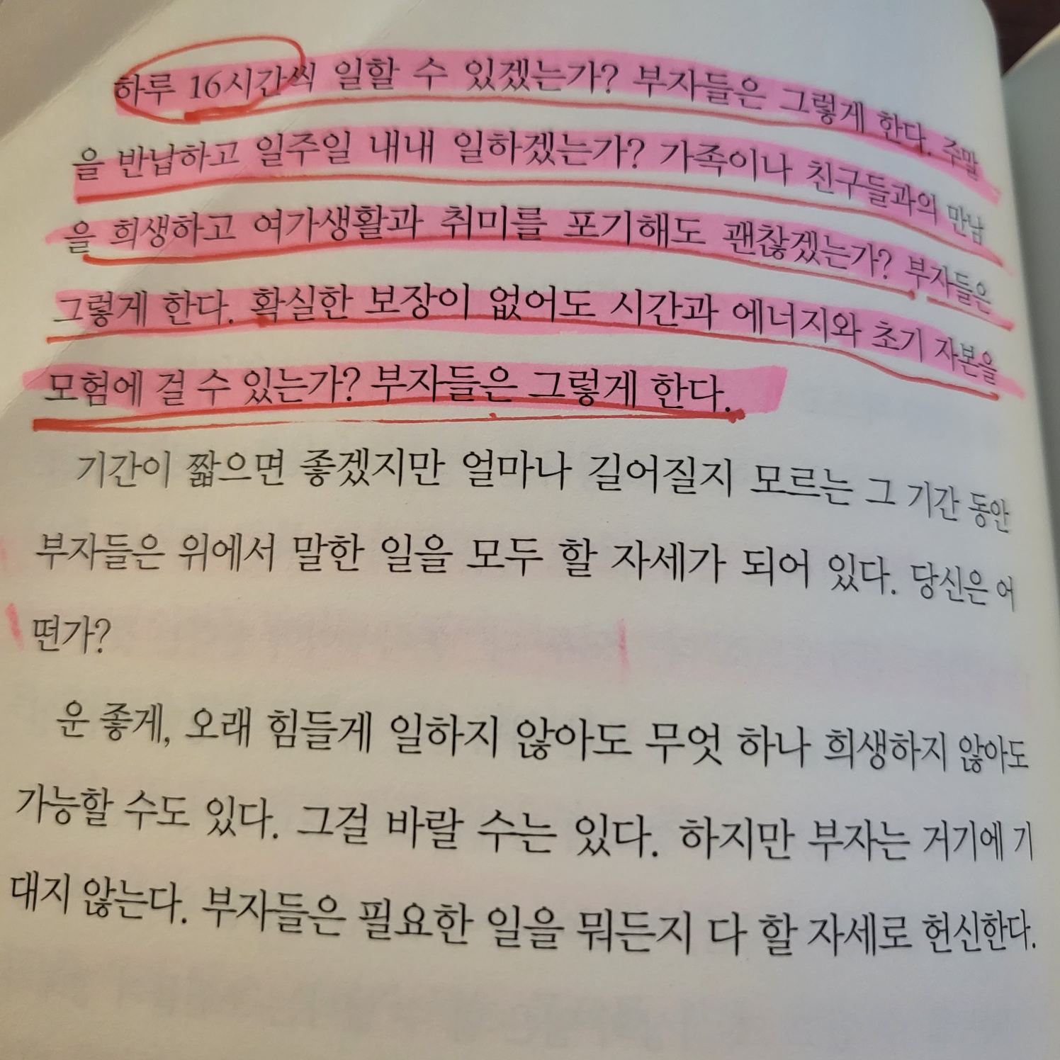 하루 16시간씩 일 할 수 있겠는가? 부자들은 그렇게 한다. 주말을 반납하고 일주일 내내 일하겠는가?