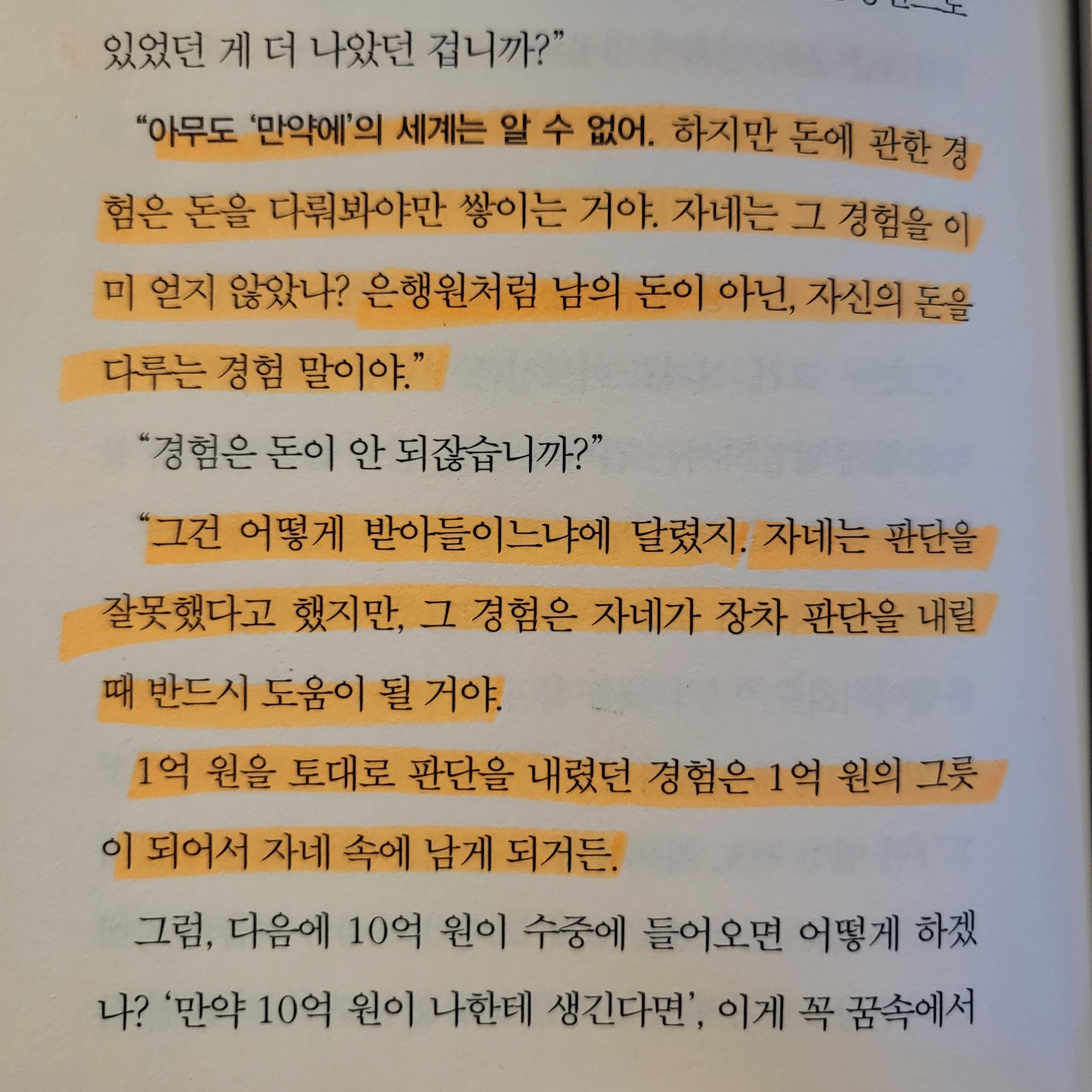 1억원을 토대로 판단을 내렸던 경험은 1억원의 그릇이 되어서 자네 속에 남게 되거든.
