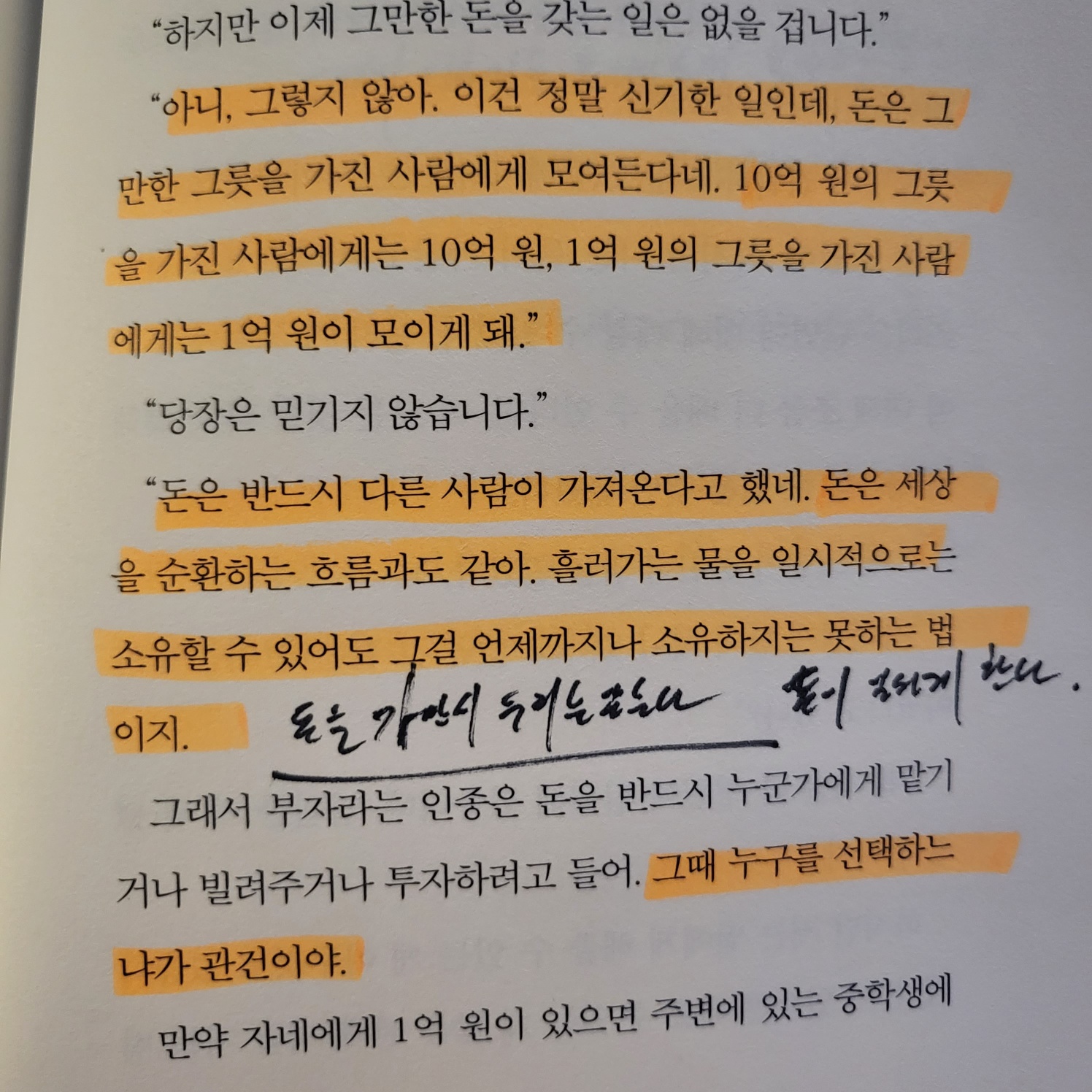 그래서 부자라는 인종은 돈을 반드시 누군가에게 맡기거나 빌려주거나 투자하려고 들어. 그때 누구를 선택하느냐가 관건이야.