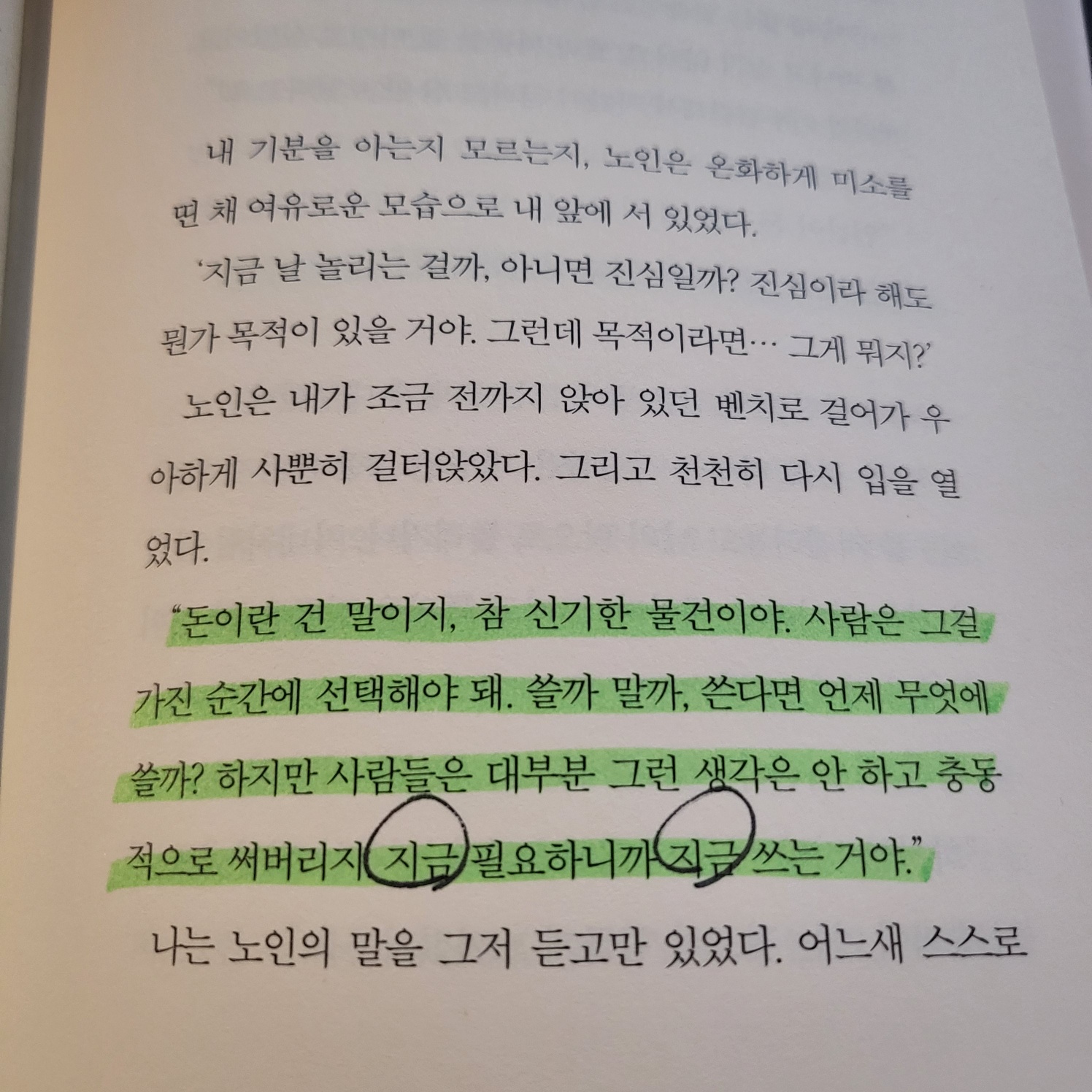 '지금' 당장 온기를 느끼고 싶다고 생각했고 그리고 나한테 돈을 빌려서 밀크티를 산 덕분에 '지금' 이렇게 재미도 없는 낯선 노인의 이야기를 듣게 됐지."