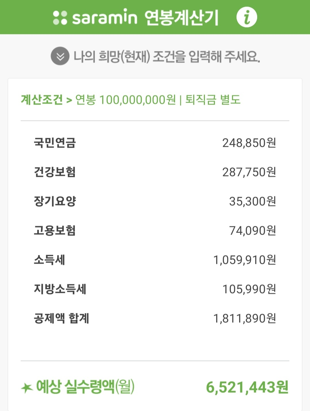 연봉 1억의 월 실수령은 6,521,443원입니다.